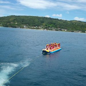 スーパーパックにしたので、イルカウォッチングとジェットスキーとバナナボートとパラセーリングとエコに参加しました。イルカウォッチングとパラセーリングはグループに分けられていて、各グループで時間が決められていました。イルカウォッチングの時は、バナナボートやシュノーケル、釣りも楽しむことができました。バナナボートは船で引っ張られる感じだったので、あまりスリル感がなく残念でした。そして野生のイルカに出会えた時は、とても感動しました。グアムに来た時はイルカウォッチングをやるべきだと思いました。パラセーリングは安全ベルトみたいなのが無かったので怖かったです。初のジェットスキーは最高に楽しく面白かったです。スピードも出せて快適でした。各アクティビティを待っている間、エコツアーやビーチバレーをしたりできたので一日海で遊ぶ事ができました。お昼ご飯は私的には美味しくなかったです。スタッフさん達もフレンドリーに接してくれたので楽しかったです。また参加したいです。