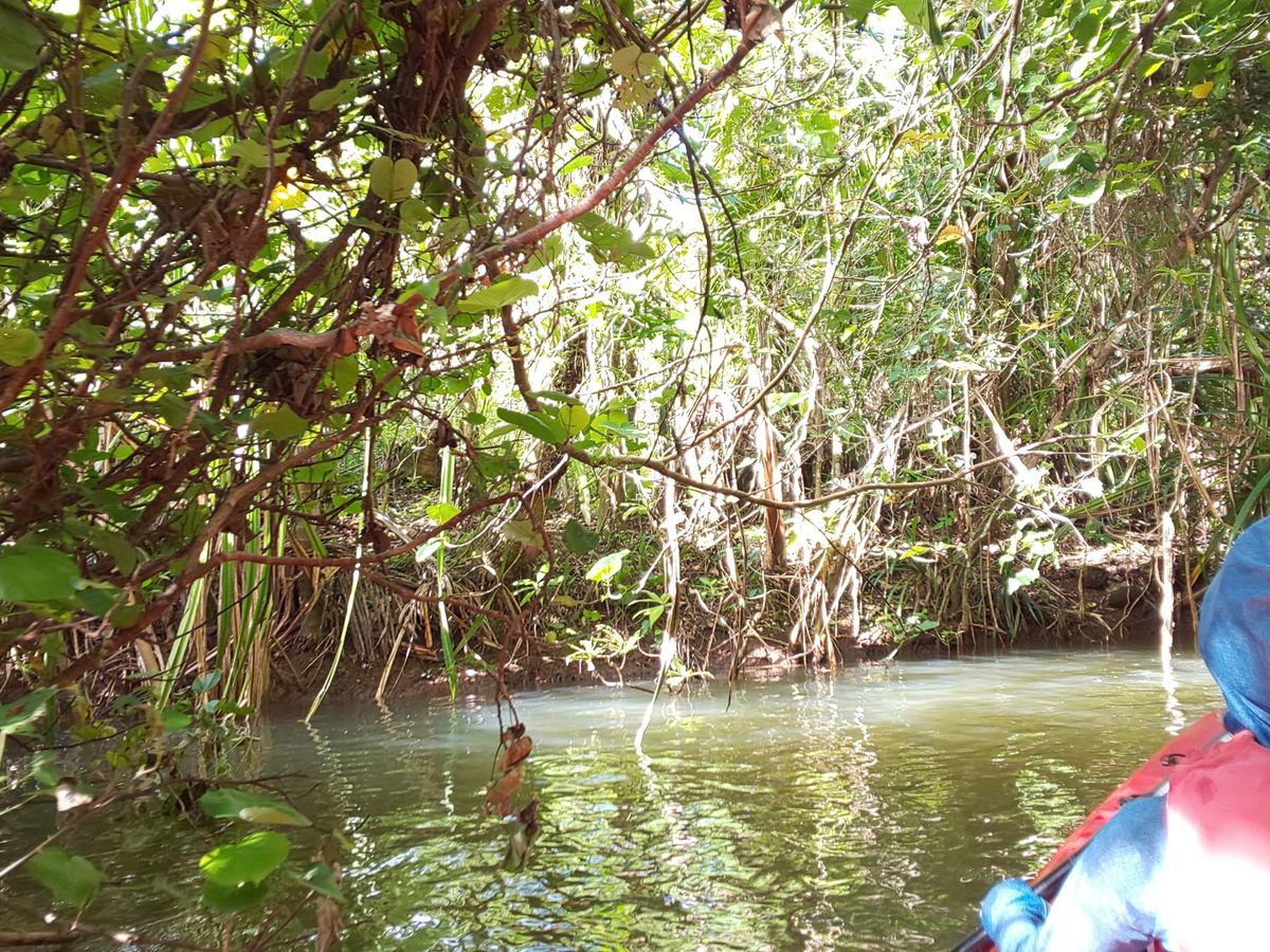 途中でガイドに水をかけられたり、魚をエサで呼んだりと遊びながら、のんびりと川上へ。だんだん川幅も狭まり、より密林感が増してくると、ドキドキ感もあっていいです。そしてある程度奥まで行ったら、Uターンして戻ってきます!