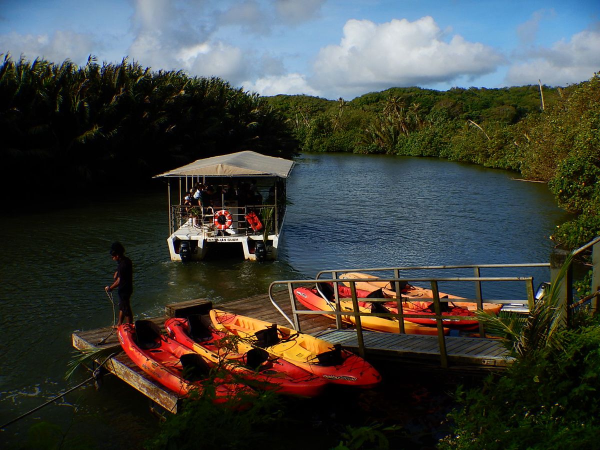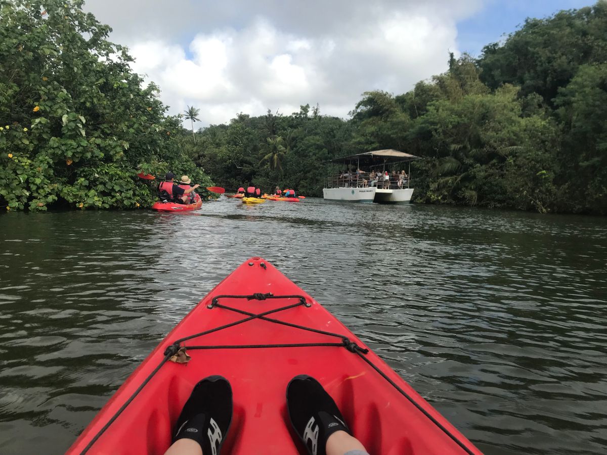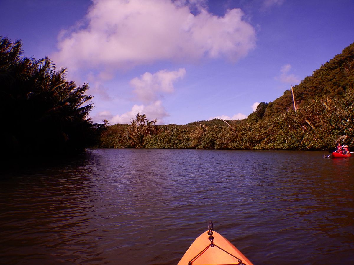 カヤックのジャングル探検を堪能しました。他の参加者達とお喋りしながら、ユックリと川登り。ガイドさんの掛け声で競争したり、蟹の住み処での餌付けや、鯰の生息エリアでのエサやりは、南国のジャングルという非日常の中の幻想体験。夢のようなひとときでした。仲良くなった参加者と繰り広げたバトルは、時代劇の川並衆みたい。途中の昼休憩のランチ後に、チャモロ族の遺跡を散策出来たのも貴重な経験でした。今、思い出しながら幻想的な光景を恋しく思います。また行きたいなぁ。