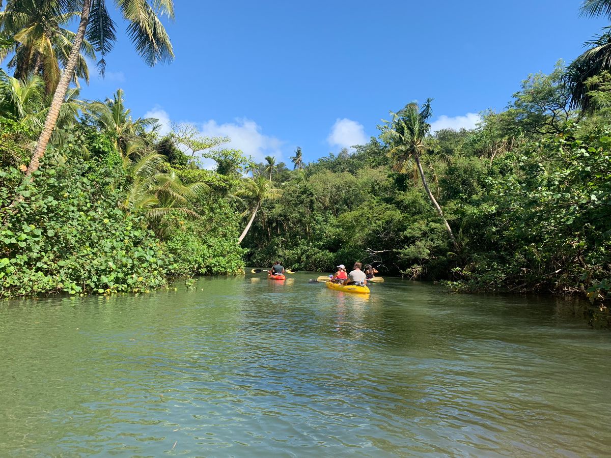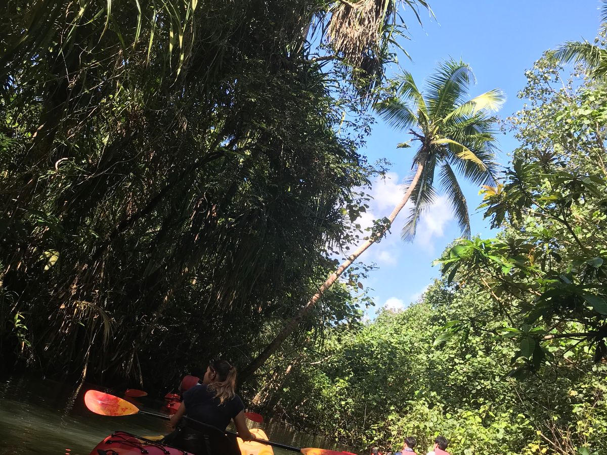 なかなか思うように進まないカヤック…笑いが止まらないほど楽しかったです。スタッフさんが所々でなかなか見られない生き物を見つけてガイドしてくれました。大きなトカゲを見たときには、しっぽの長さにびっくりしました。ランチはアドベンチャーパーク内でのチャモロごはん。現地スタッフさんとのやり取り、とても楽しかったです。