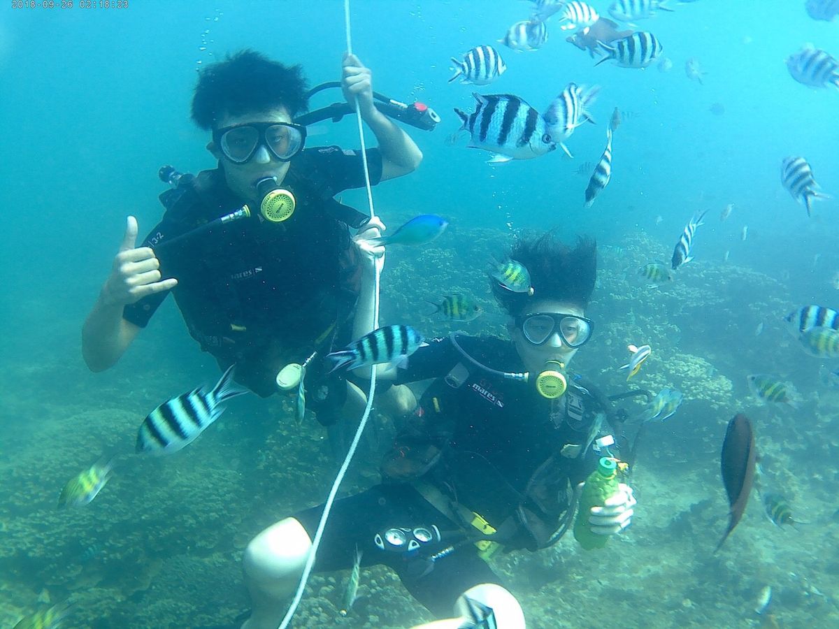 午前のワンダイブに参加しました。友人は泳ぐことが苦手でビーチからのダイブでは、酸素ボンベをダイブする場所まで運ぶことがかなり大変で、生まれたての子鹿のようでしたが、スタッフさんにかなり助けて頂きました。初めてのダイビングを楽しむことができました。インストラクトもとても面白かったです。ダイブ中に、バブルリングも見せて下さいました。魚も身近にたくさん見ることができ、感動しました。本当にありがとうございました!