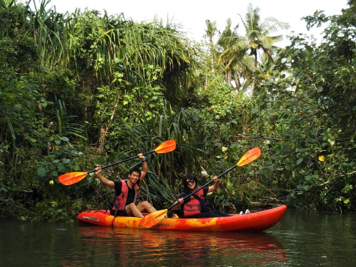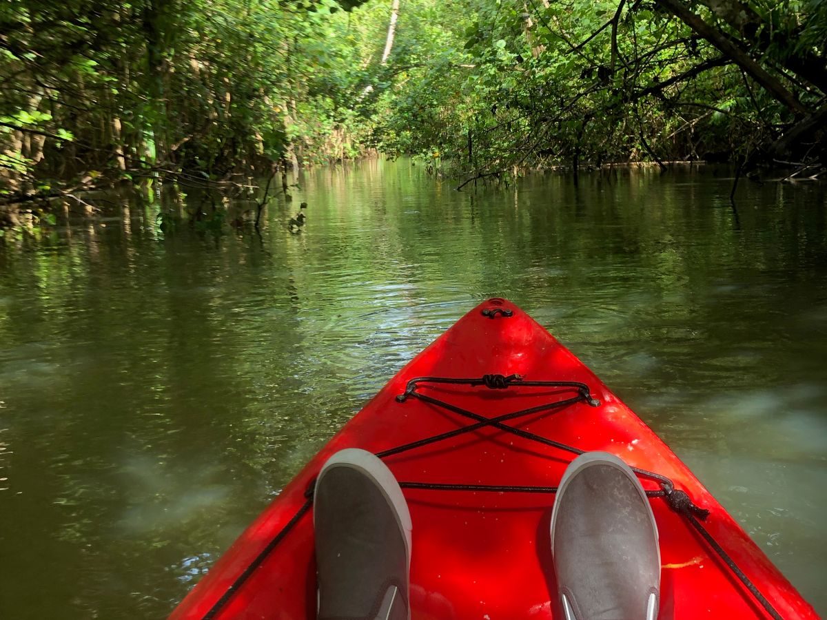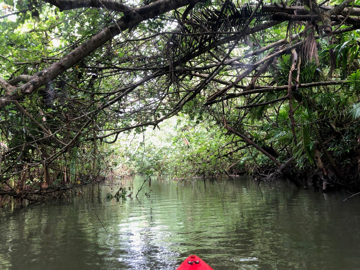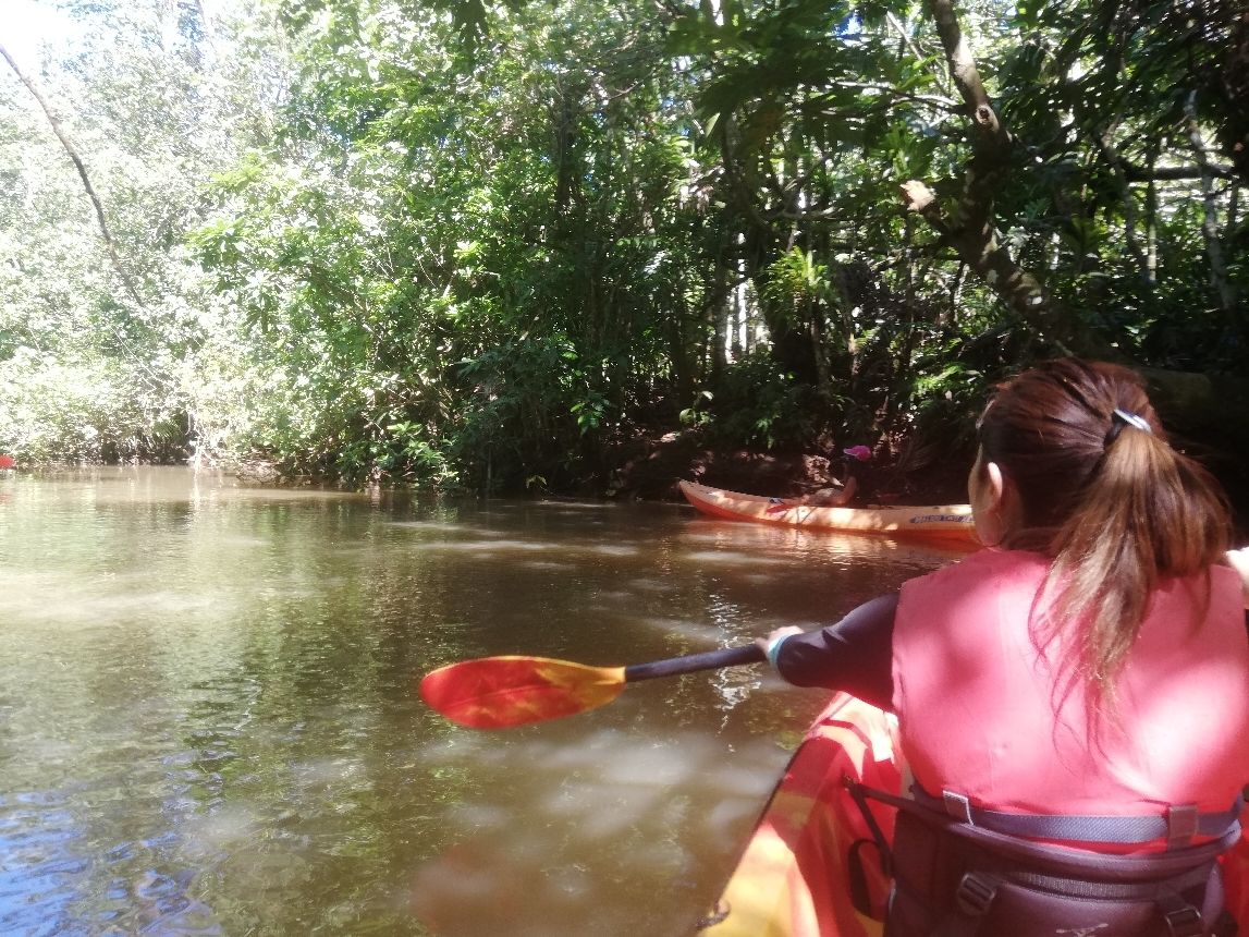 今回、カヤック初心者2人で参加しました。他の参加者は2組でこちらも初心者の様子でした。明るく気さくなガイドさんに先導されて、計4艇のカヤックでジャングルに繰り出しました。