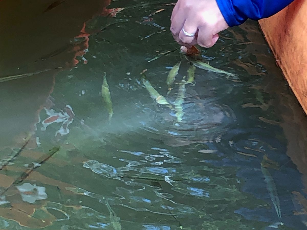 ガイドのお姉さん持参のパンで川に住む魚やカニに餌をあげたりもしました。
