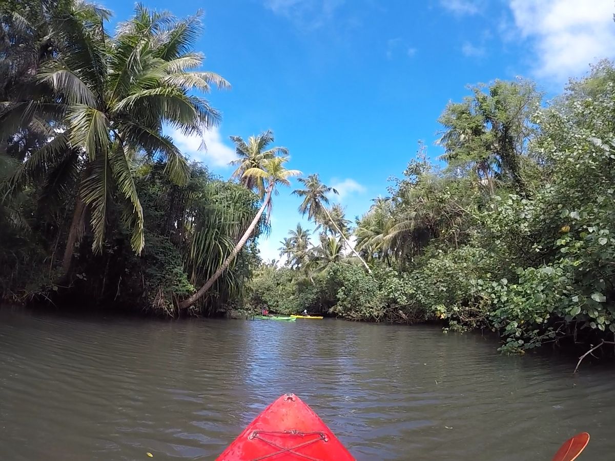 往復送迎は同時間のジャングルボートツアー?の方々といっしょのバスに乗り込み、カヤック参加は全員日本人のカップルと夫婦の合計3組でした。この日のカヤックはかなりペースが速く進んだようで、時間が余るのでふだんあまり行かないルートまでくまなく回ったよ~とガイドさんがおっしゃっていました。パイナップル畑の横を通過したり、大きなカニや、たくさんの淡水魚を見ることができて、ジャングル満喫しました。