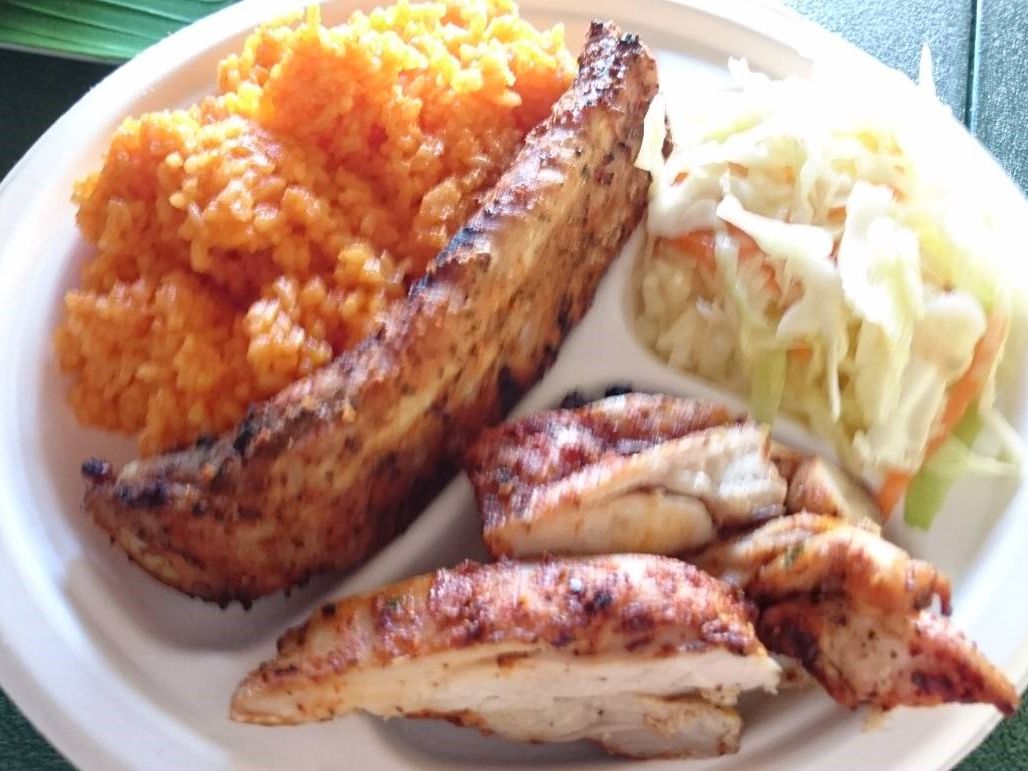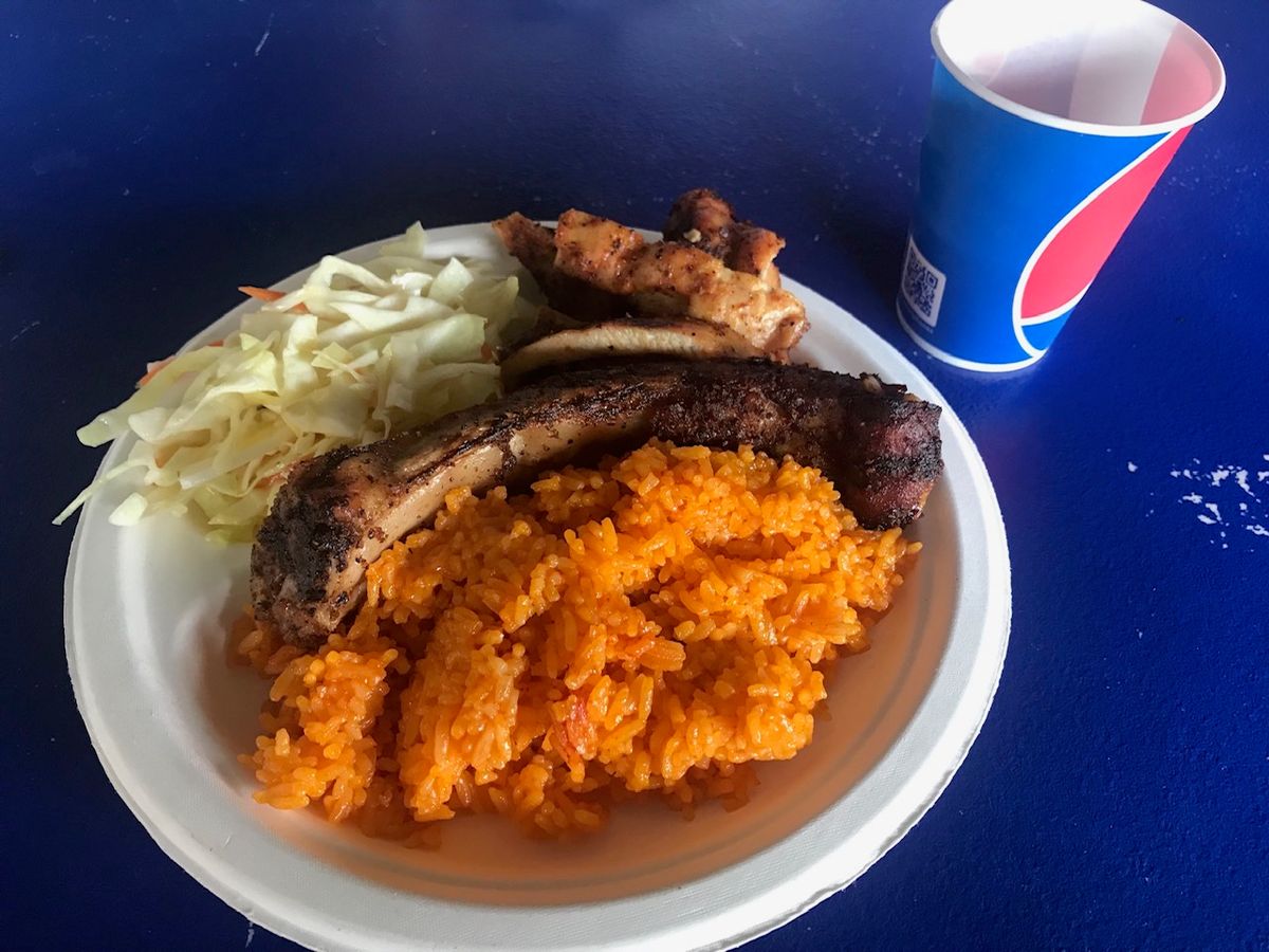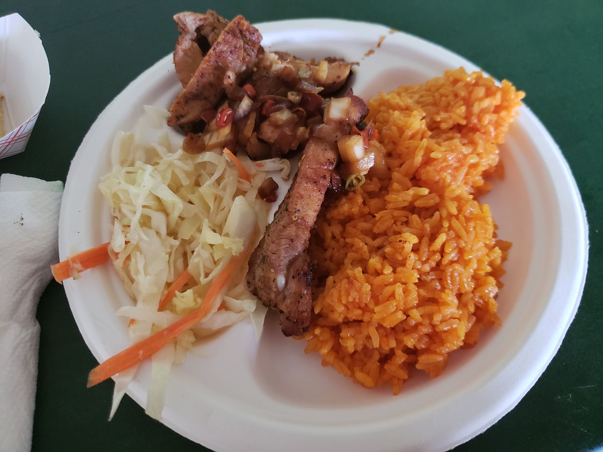 内容はレッドライス、ポークとチキンのバーベキュー、サラダ、デザート、飲み物には水とレモンティー(甘い)が用意されていました。