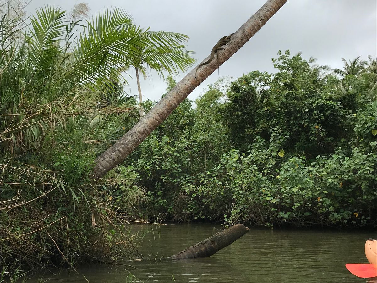 転覆しない様にと始めは慎重だったが、意外と簡単で直ぐ慣れました。インストラクターの船を先頭に、ニ隻はあっち行ったりこっち行ったりと悪戦苦闘しながら約一時間くらい川の上流へと進みました。途中、魚や、オオトカゲ、カニさんと戯れながらチャロモ村に到着。