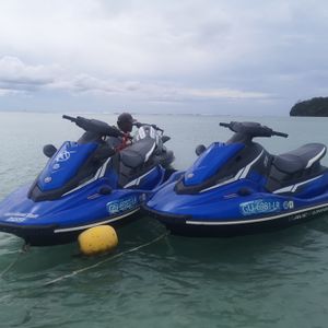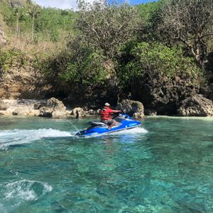 今回初ジェットスキー体験でした。まずは4種類のジェットスキーから好きなものを選んでとのこと。(色の他、スペックが異なるようです)選んだらインストラクターから操作方法を教えてもらいます。(英語なので少しわかりづらい部分もありましたが、ニュアンスでカバー出来る程度)実際走らせてみると意外と難しい!ただ5分もすればすっかり慣れて、凄く楽しかったです。30分ほど走らせて、アグエコーブに到着。水が底まで見えるほど透き通って綺麗でした。泳いで良いとのことでしたので、降りてぷかぷか浮いてみたり、底を覗いてみたり。10分ほど遊んで帰路につきました。ジェットスキーをやったことのない方は是非この機会に!とても楽しかったです。