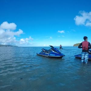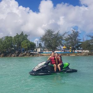 友人と2人で2人乗りを交代で運転しました。天気にも恵まれ快晴の中海の上を走るのはなかなか爽快でした!操作も難しくありませんが、波の抵抗があるので腕にかなりきます。それでも今まで乗った乗り物で一番面白かったです!教えてくれたキャプテンは現地の方でしたが日本語も片言で話せるので問題なかったです。かなりノリも良く楽しく過ごせましたありがとうございました。日本人の方もいました。アグエコーブは天気が良くても波の状況で入り江に行けないこともあり、私たちは波が荒れていて入れなかったのでそこだけ残念でした。防水カメラ等を持っていくと恋人岬の前で写真を撮ってくれたのもよかったです!スクリーマーはバナナボートをほんとに激しくしたようなもので、ただジェットスキーに引きずられそれが海に落ちるまで続きます。落ちるまでがしんどいですが一度海に落ちてしまうと気持ちよくたのしかったです。グアムに訪れた際はまたジェットスキーリベンジしたいです!
