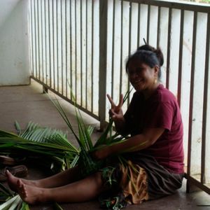 おじさんがしゃべりながら、ヤシの葉に似た葉っぱで器用に髪飾りや魚のモビール的なものを作って、みんなにプレゼントしてくれました。
