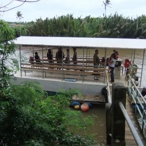 迎えの大型バスに乗り込むと、島を横断する約30分のドライブです。河口部にある乗船場に着くと、トイレがあってそこでトイレをすませていよいよ乗船です。船は屋根付きの双胴船で正方形のオープンエア屋形船ってかんじです。