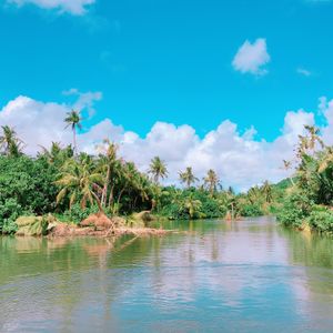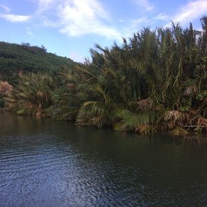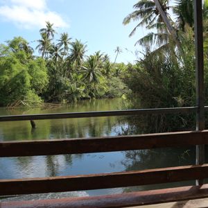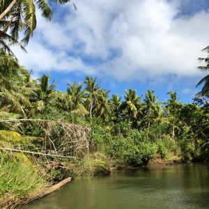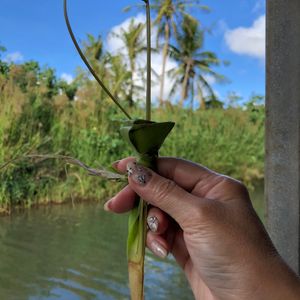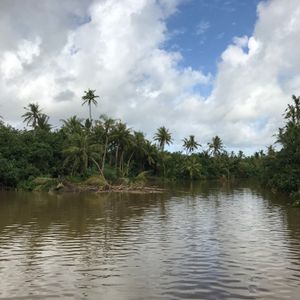 快晴、気温30度以上のわりには、船の中は涼しい風が通り気持ちよく過ごせました。途中でガイドさんが川に生息する魚やカニ、ウナギなどを見つけてくれて、船を止めて写真を撮ったりする時間もありました。また、船の中からスタッフの方が魚をつったり、全員にヤシの葉細工を作ってプレゼントしてくれました。チャモロ村に到着後、古代遺跡や伝統文化に触れる事が出来ました。昔の人の火起こしを再現したり、ヤシの実割りを体験したり、水牛に乗ったりといろいろ楽しめました。ラッテストーンも見る事が出来て満足しました。