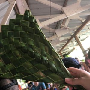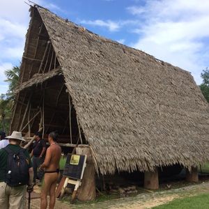 文化体験施設で古代遺跡を見学、ヤシの葉での編み物を記念品にいただき、火起こし体験等をしながら!ご飯を食べて、解散という感じでした。