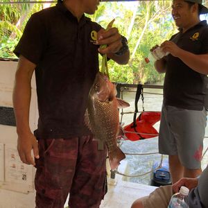 ズの始まり。船の中から魚に餌をあげたり、カニの住みかに寄ったり、スタッフが釣った魚で記念写真を撮ったり、スタッフがヤシの葉細工で魚やお花などいろいろ作ってくださったりと楽しく過ごしているうちにチャモロ人村に到着。ここではいろんな伝統文化に触れる事が出来ました。火起こし見学もできました。動物たちもいて、水牛にも乗る事も出来てとても楽しいツアーでした。昼食はバーベキューがお皿に一人ずつ配られました。お味はまあまあ笑でした。