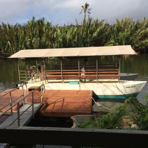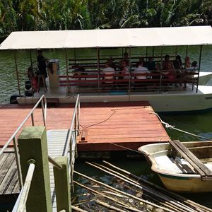 スクールバスの払下げだと思われるバスでお迎え。40分ほど山道を進むとボード乗り場につきます。クルーズでは、ヤシ蟹やなまず、サヨリなどいろいろなお魚を見ることができました。4歳の娘もとてもよろこんでいました。その後昔の家の見学、椰子の葉っぱを使って帽子や魚を編んでくれたりチャロモ文化に触れることもできました。最後に水牛に乗って写真をパチリ。普段は船酔いする旦那でも大丈夫でしたし、スタッフさんもいろいろな話をしてくれてとても楽しかったです。チャロモデザートつきとあったので期待していましたが、単なるかき氷でした。蚊が多かったので虫よけは必須です。