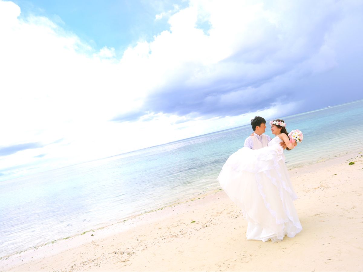 この度は、お世話になりました。ウェディングドレス&タキシードは、新品のように綺麗で大満足でした。メイク&ヘアセットも丁寧に仕上げて頂きました。問題は、当日の天気です。ビーチの天気は快晴で良かったのですが、強風で前髪全開…涙め…鼻水で、写真撮影どころではなくティッシュが手放せない状態で、笑顔と言われても強風で目を開けてる事も出来ず、それがとても残念でした。完成した写真も、予想通りの半目の笑顔なしでした。このプラン事態には、特に問題なしでおすすめです。(ティッシュを下さったカメラマンさん、有り難うございました)