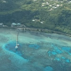 アップロードした写真ですが、岸から線のようなものが出てて、海の真ん中に白い丸いものがあるのがわかりますか? ここはこのベルトラで参加したポリネシアンショー(海中展望塔見学つき)の海中展望塔なんです。昨日陸から行った場所を上から見たのには感動しました。