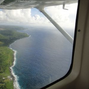 当日、深夜3時過ぎに滞在ホテルに到着して、フロントからリコンファームをお願いしたら留守電はなく不在のため、朝もう一度電話しなくては、と思っていましたが、母と二人でバタバタとしていたら約束の7時を少し過ぎてしまいましたが、スタッフさんが、ロビーでもうすでにお待ちになってくださいました。空港へと迎い、途中、立ち入り許可証の札を着けて、事務所で署名にサインをして、セスナに乗り込みました。滑走路まで行き、徐々に500メートルの高度まで上がり、水平飛行になり、タモン湾を眺め、恋人岬の方までぐるっと近付いていき、アガニャ湾とアガニャの町をご紹介してくださり、はるか下界に海中展望塔が見えました。海の色々が見事に見えてたくさん写真を撮りました。