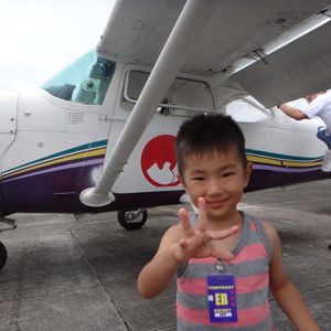 操縦を心待ちにしている息子は緊張する様子もなくリラックスしていました。待ち時間にビデオでイメトレをし、いざセスナへ!