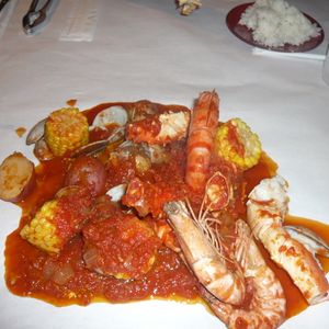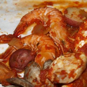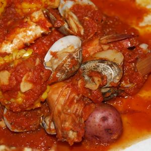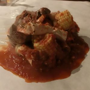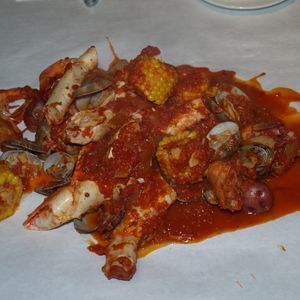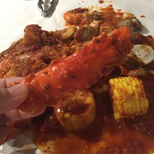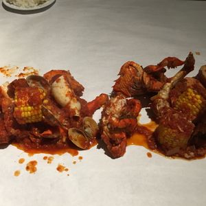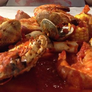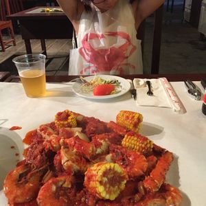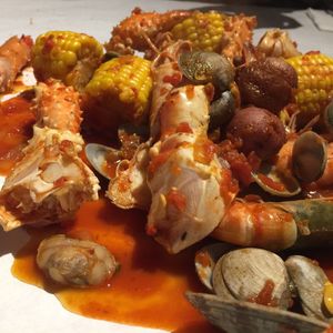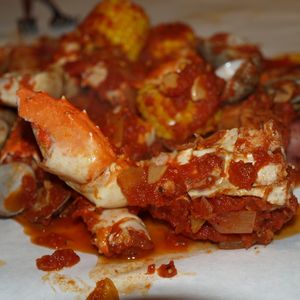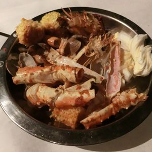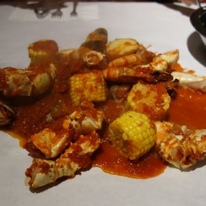 蒸したカニ、エビ、コーン、ジャガイモにトマトチリソースが絡まって、とってもおいしかったです!