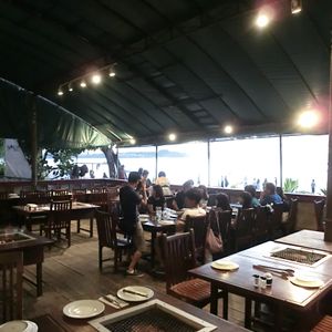 店内はオープンエアでなかなかいい雰囲気、BBQのテーブルよりは遠いもののタモンビーチを眺めながら食事が出来ます。