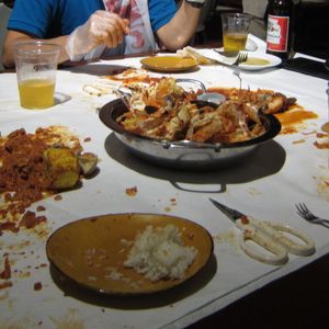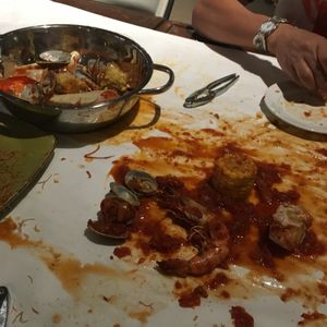 スパイシーなトマトソースがシーフドにあいますよね!おしぼりはスタッフにお申し付けくださいね。手を洗う場所も設けております。