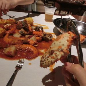 屋根付きですが屋外の場所でした。席に案内されて先に飲み物を注文しますが、席の担当は特に決まっていないようで、なんと4回も注文を取りに来ました。テーブルの上には白い紙が敷いてあります。飲み物が先に来て、しばらく待っているとビニール袋に入った料理を持ったスタッフが来て、目の前でその紙の上に料理を出して「さあどうぞ」と言われます。カニ、アサリ、エビ、トウモロコシ、ジャガイモをにんにくと唐辛子の効いたトマトソースで調理してあります。後でライスも出てきて、ライスで食べるのか~と不思議な感じでした。カニもエビも大きくて食べ応えがあります。ジャガイモ、トウモロコシ、ライスと炭水化物がたくさんあるので、お腹がいっぱいになりました。ソースが辛くてビールが進む味です。カニの殻が硬くて、なかなか割れなくて苦労していると「あれ、ハサミなかった?」といいながらスタッフがハサミを持ってきました。このハサミは良く切れるのでようやく食べやすくなった感じです。なのでテーブルに置いてない場合は催促してください(笑)。手が汚れますが、おてふきが一つしかなく、足りないので追加で持ってきてもらいました。もうちょっと料金が安くてもいいかな~と思いましたが、大きなカニとエビの材料費も高いのでしょうね。手を使って食べるのは大変ですが面白い経験でした。