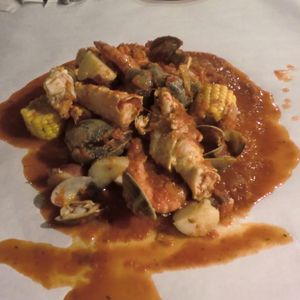 トマトベースの濃いスープで煮こまれた魚介は、柔らかくて味もしみてなかなか美味しい。