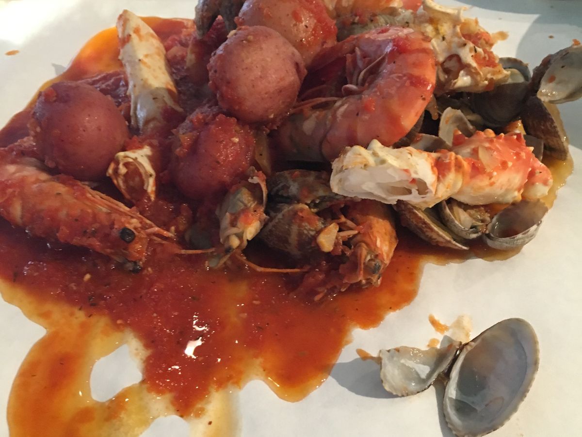 蒸したカニ、エビ、コーン、ジャガイモにトマトチリソースが絡まって、とってもおいしかったです!