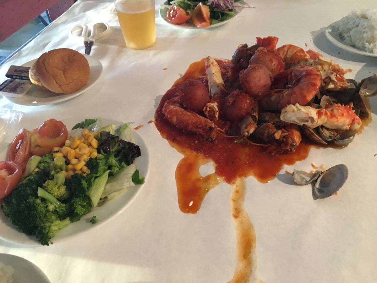 予約済のテーブルに案内されると他のテーブルとは少し様子が違いました。予約席だからか白い紙がテーブル一杯に敷いてあります。少し優越感に浸ります。そこへウェイターが大きな金属製の器のボールの中から、タラバカニとエビと貝類やトーモロコシやジャガイモなどの入ったビニール袋を取り出し、逆さまにして白い紙の上にブチ開けました。テーブル全体に赤い料理の山です。それを手づかみで食べるのです。豪快で気分はワイルドでしたが、両手は真っ赤っかです。鼻も掻くことは出来ませんでしたが、とてもお勧めです。