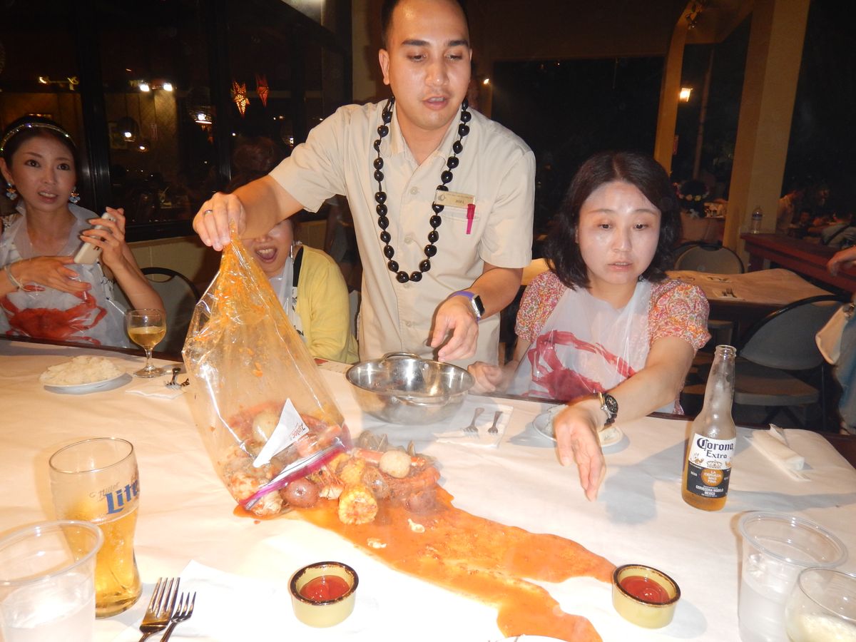 1袋が2人前でした。グアムにいたときは肉ばかりだったので最初食べ始めたときはシーフードのおいしさに夢中になって食べました。ドリンクは別料金で、ライスはついてました。ピリッとする辛さがビールとよく合って楽しめました。具はカニ、エビ、とうもろこし、じゃがいも、貝です。少ないように思ってましたが、男性2、女性2でも満腹になりました。最後の方はすごく辛く感じてきて唇が痛かったです。エプロンとナプキン、おしぼりがあるだけで手づかみで食べます。手づかみで食べたいけど手が汚れるのは嫌だったので、使い捨てのビニール手袋を持参してたのが大活躍でした。冷静に考えると料金は高いと思うけど、非日常な感覚とノリが楽しめるので、家族で行くよりは友達同士の方をおススメします