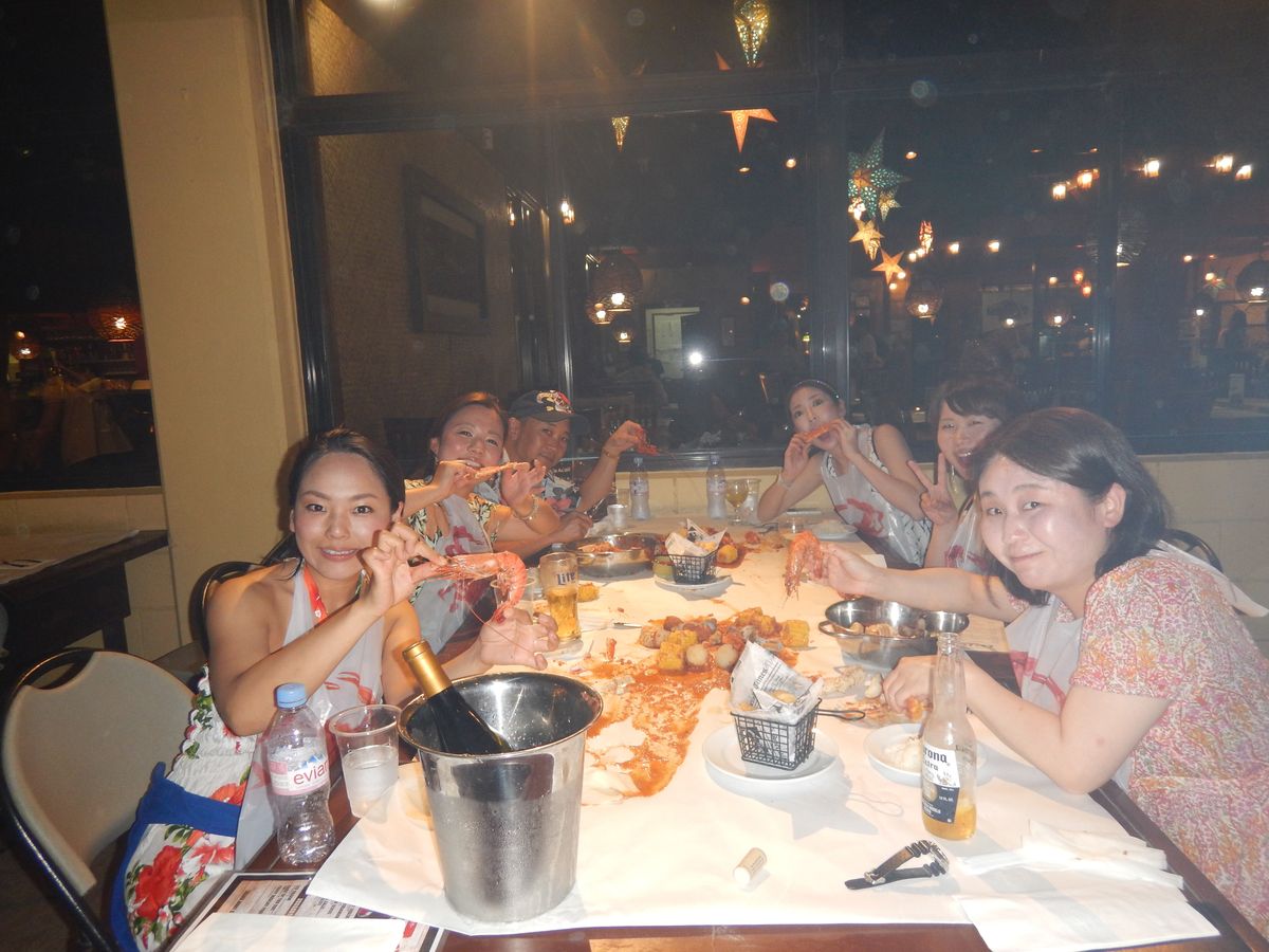 シーフードが食べたいので検索したところ、モヤモヤさまぁ〜ず2でやっていたCrackin' KitchenがセイルズBBQで4月に新メニューとして加わったと知り、一度はやりたかったので迷わず予約しました。席につくとテーブルに白い紙。これから始まるワイルドなディナーにワクワク感が止まらず興奮状態。それを静めるべく、とりあえずビール。ビーチからの心地よい風が、リゾート地ならではの開放感を漂わせます。メインが運ばれる前のビュッフェでの食事も、友達との会話も、より一層楽しく感じられます。ついにシーフードの登場。店員さんがビニール袋から豪快にドバーっと!おぉー!ヤッター!っとつい声に出てしまう演出。すぐさまカニに飛びつき殻ごと食らいつく変わり者の友達。手づかみならではの楽しさが皆を笑顔にします。味は抜群!辛さも丁度良く、ビールに最高。カニの身の大きさも量も大満足。残ったソースにパスタを絡ませて食べたいところでしたが、すでにお腹いっぱい。次回は絶対食べます。シーフードもグアムもますます大好きに。素敵な時間を過ごす事が出来ました。