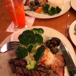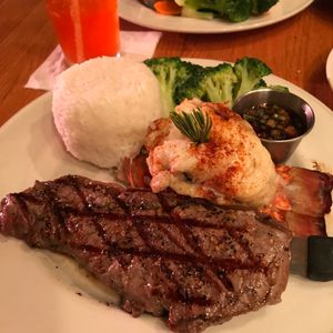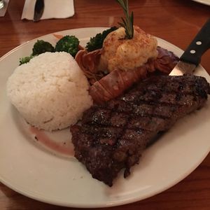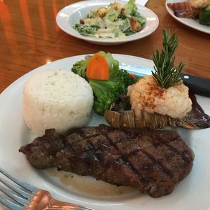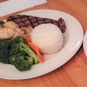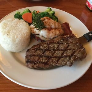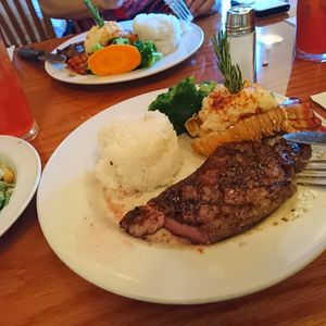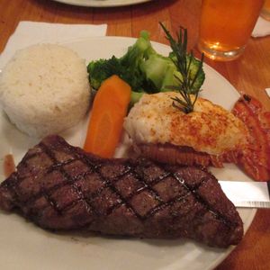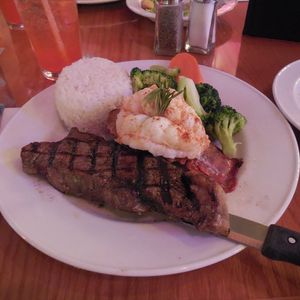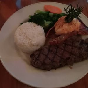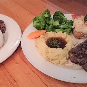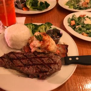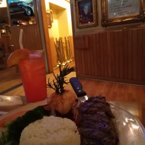 食事は期待通りのボリュームで、ステーキもロブスターもとても美味しかったです。サイドのシーザーサラダがとても好みの味でおかわりしたいくらいでした。コースには含まれていないドリンクはクーポンをいただきサービスしてくれました。(パラダイス・ドリンク?なるグアムっぽいソーダでした)ちなみにA-1ソースをボトルでサーブしていただいたのでお好みで使ってみても良いかと思います。