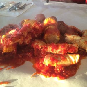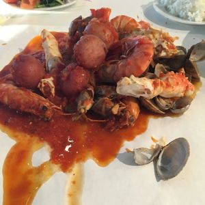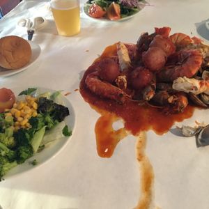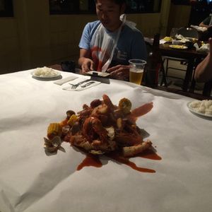 予約済のテーブルに案内されると他のテーブルとは少し様子が違いました。予約席だからか白い紙がテーブル一杯に敷いてあります。少し優越感に浸ります。そこへウェイターが大きな金属製の器のボールの中から、タラバカニとエビと貝類やトーモロコシやジャガイモなどの入ったビニール袋を取り出し、逆さまにして白い紙の上にブチ開けました。テーブル全体に赤い料理の山です。それを手づかみで食べるのです。豪快で気分はワイルドでしたが、両手は真っ赤っかです。鼻も掻くことは出来ませんでしたが、とてもお勧めです。