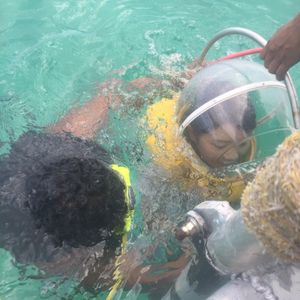 頭に酸素を届ける重いヘルメットのようなものを被り海の中を歩きます。海の中には手すりがあるので、それに沿って歩きます。沢山の魚がおり、餌付けが出来るように餌をくれます。なんだか不思議な体験でした。海から出るとスコールのような大雨。さっきまであんなに晴れていたのに。。笑