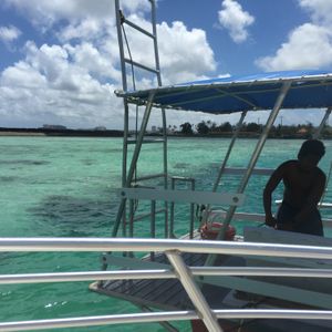 次は場所を変えてパラセーリングとバナナボートをしました。移動は車でしますが水着のままでオッケーです!パラセーリングも携帯持たせてくれますし下からも写真沢山撮ってくれました☆バナナボートも同様に沢山写真撮ってくれます!そして最後に一番楽しみにしてたリーフウォーカー!リーフウォーカー用の船に乗り換えます。ヘルメットは35キロもあり驚きましたが潜ってしまうと体感5キロと女性でも大丈夫です!海中に手すりが埋め込まれてあるので手すりをつたって少し進むとガイドさんがソーセージをくれます。沢山の魚が目の前に集まるのでとても楽しめました!ガイドさんがエンジェルリングも披露してくれます☆中々観れるものではないのでいい体験が出来ました(^o^)