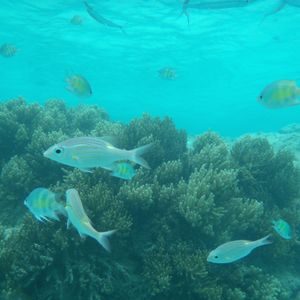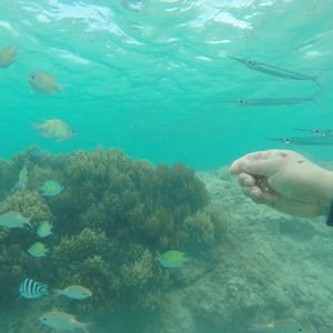 潜る深さは5〜6メートル程でした。海底に行きインストラクターからもらった餌をあげると、たくさんの魚が目の前に集まってくるので、とても綺麗でした。