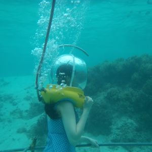 魚に餌をあげたりサンゴを触ったりガイドさんが芸を見せてくれたり、面白かったです!なにより顔が濡れない所がとてもよかったです。しかし水中にいても重さを感じ、垂直に立つ事が難しかったです。