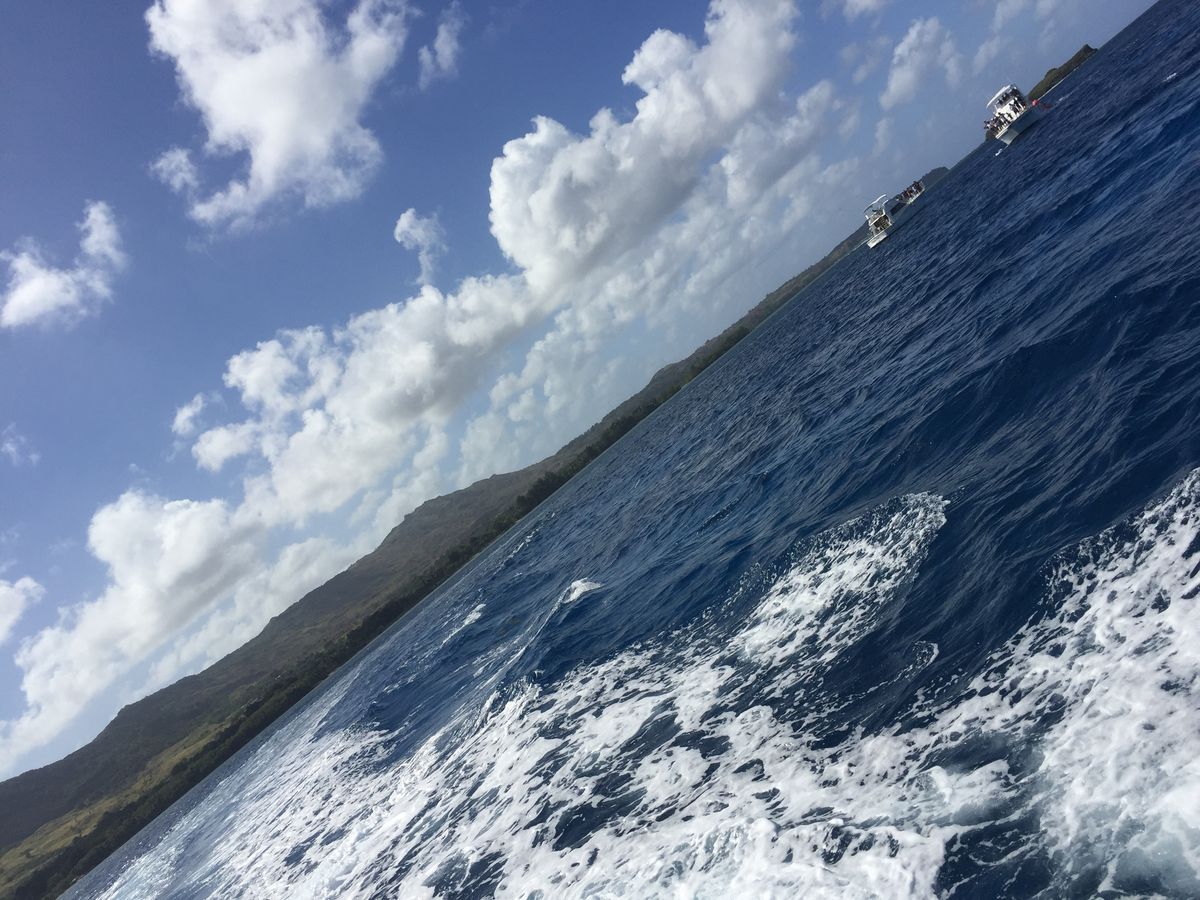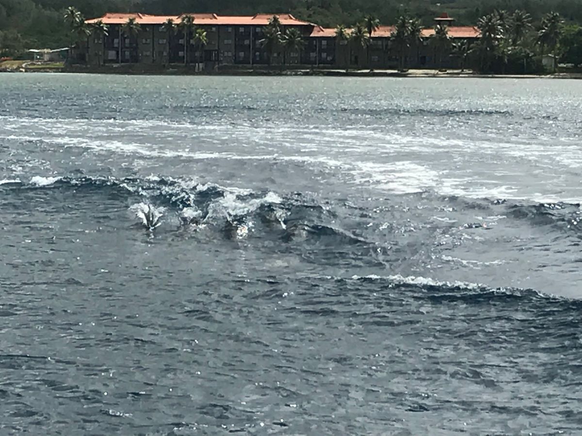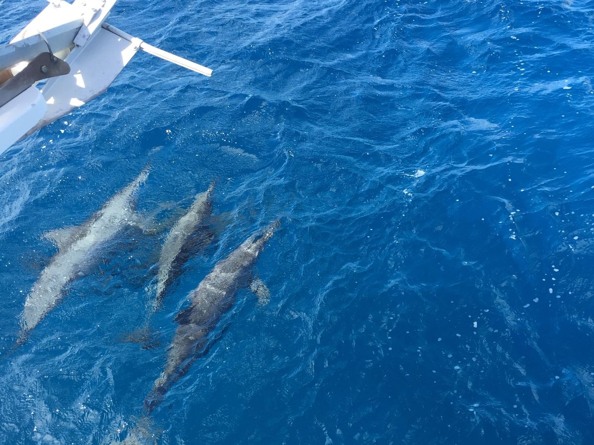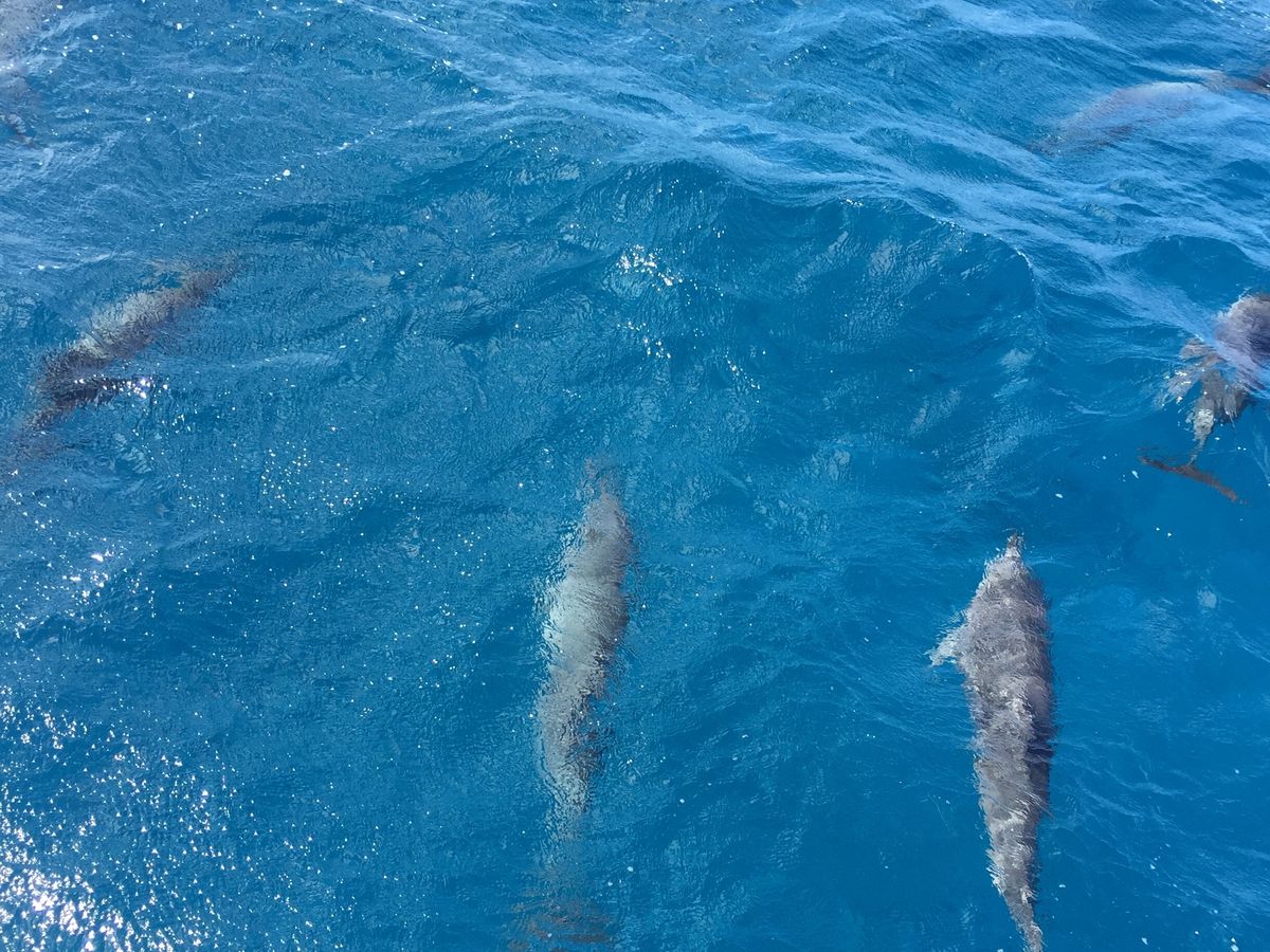 前回ハワイで、ウミガメと一緒に泳いできたので、今回はイルカを見に行きました。実際見れるのは、数匹ぐらいかなと思っていましたが、予想を上回る数のイルカの群れと、ボートが作る波を楽しそうにピョンピョン飛び跳ねながら追いかけてくる、イルカたちの愛らしさに非常に興奮しました。