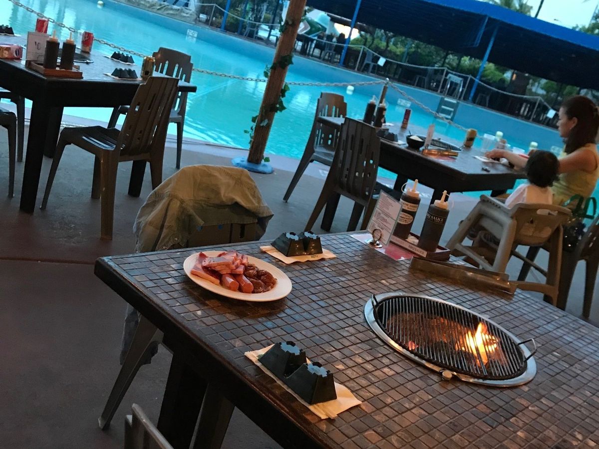肉、エビ、イカ、貝、タマネギ、ピーマンなど焼き放題。他にはサラダ、フルーツ、フライドポテト、唐揚げ、アイス、ライスなどが食べ放題、ビール、ソフトドリンクが飲み放題。追加料金でアラカルトメニュー、カクテルなどがありました。牛肉が、柔らかくておいしかったです。子供は唐揚げとポテトとアイスがあるのでお腹も満たされ、お肉を焼くのも楽しかったようです。ただ、煙が充満していました。