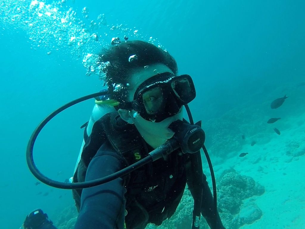 それから、簡単な講習を受けて浅瀬で機材の使い方などを教えていただきました。その後、5メートルから10メートルまで深度を上げて潜りました。