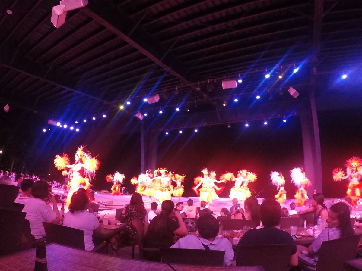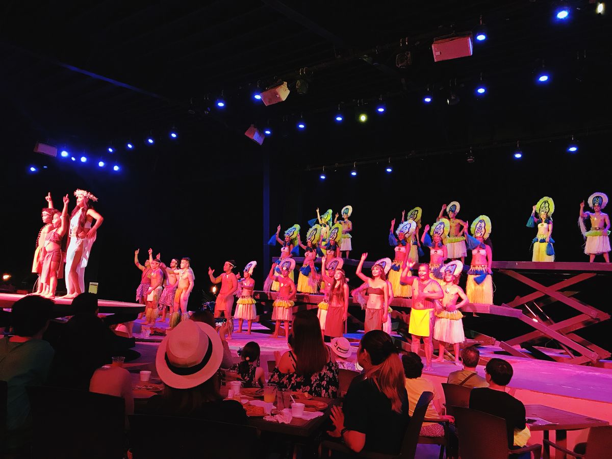 ビュッフェを1時間ほど楽しんだのち、ショータイムだった。ビュッフェは特に肉料理やサラダの種類が充実していて、デザートにはアイスやケーキもあった。フラやタヒチアンダンス、ファイアーパフォーマンスを通してグアムの歴史をストーリー性を持ちながら表現していて見応えがあった。また、観客席で踊ったり、観客を舞台に上げて一緒に踊るなど会場が一体となったパフォーマンスをしておりとても盛り上がっていた。最後にキャストの方々と記念写真を撮ることもできて大満足である。グアムに来たらまた見に行きたいと思った。