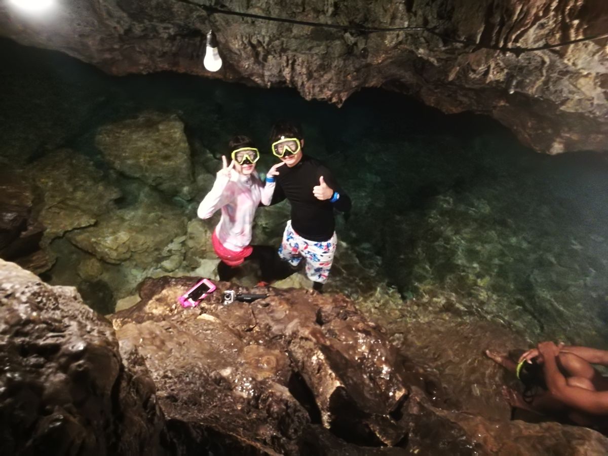 最後に洞窟ツアーへ。近場にありました。とても暗く電気を付けて入りました。水は冷たかったですがとても綺麗で、ゴーグルを借りて潜ったりして楽しみました。