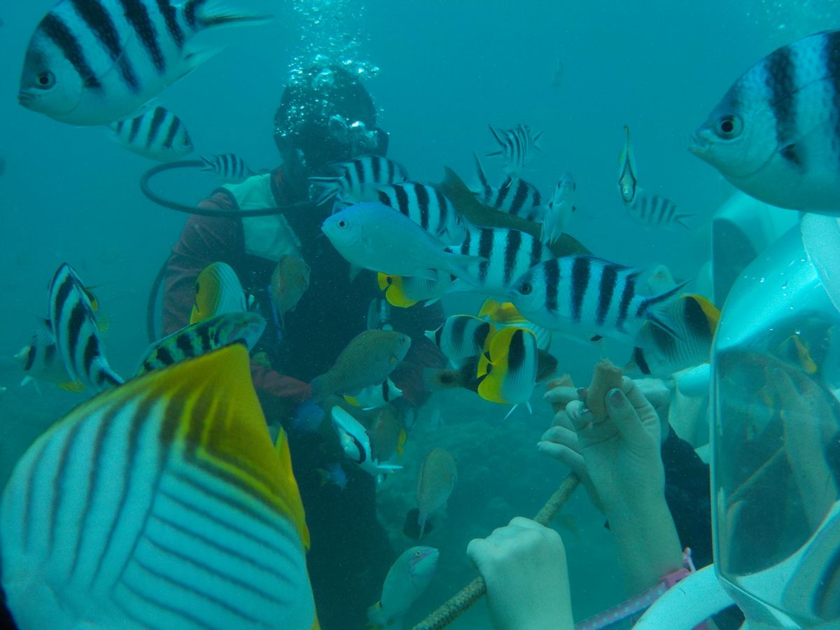 シーウォークとシュノーケリングを体験。シーウォークは船で沖に出るわけではなく、浜辺から歩いて潜っていく感じです。そこそこ魚もいて楽しめます。着替えを持ってきてる人はおらず、上に何か羽織ってホテルに帰るのがほとんどです。カメラや携帯は貴重品として預けずに、現地まで持っていった方がいいです。
