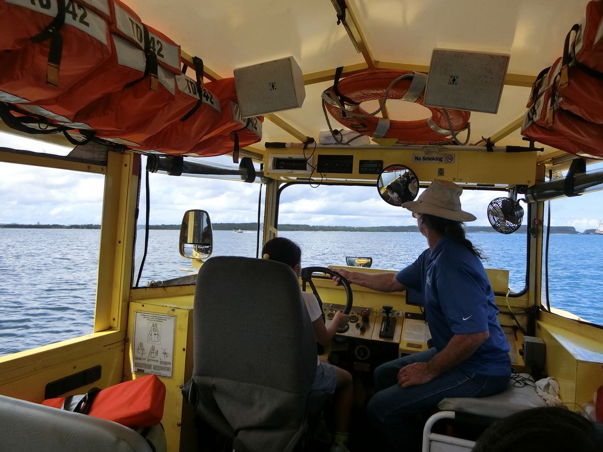 乗車の際、子どもも大人も、全員にアヒル口の笛が配られます。バスのガイドは英語ですが、車内では日本語でアナウンスが流れていました。ユーモアに富んだ内容で、アナウンスに従ってアヒル笛をみんなで吹いたりして、盛り上がりました。所定の港にて、ドライバーが交代し、スプラッシュイン! 陸から海へ入る瞬間が面白かったです。でも、外から水陸両用車の状態が見られないのは残念。海に入ると、子どもは順番に操縦席に座らせてもらい、操縦体験が出来ます。一通り操縦体験が終わると、陸に上がり、アガニア地区をドライブしますが、メイン通りを普通の速度で通り過ぎる程度で、ゆっくりパノラマ観光、というわけには行きませんでした。