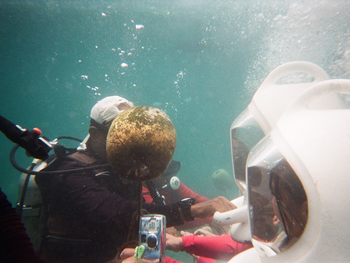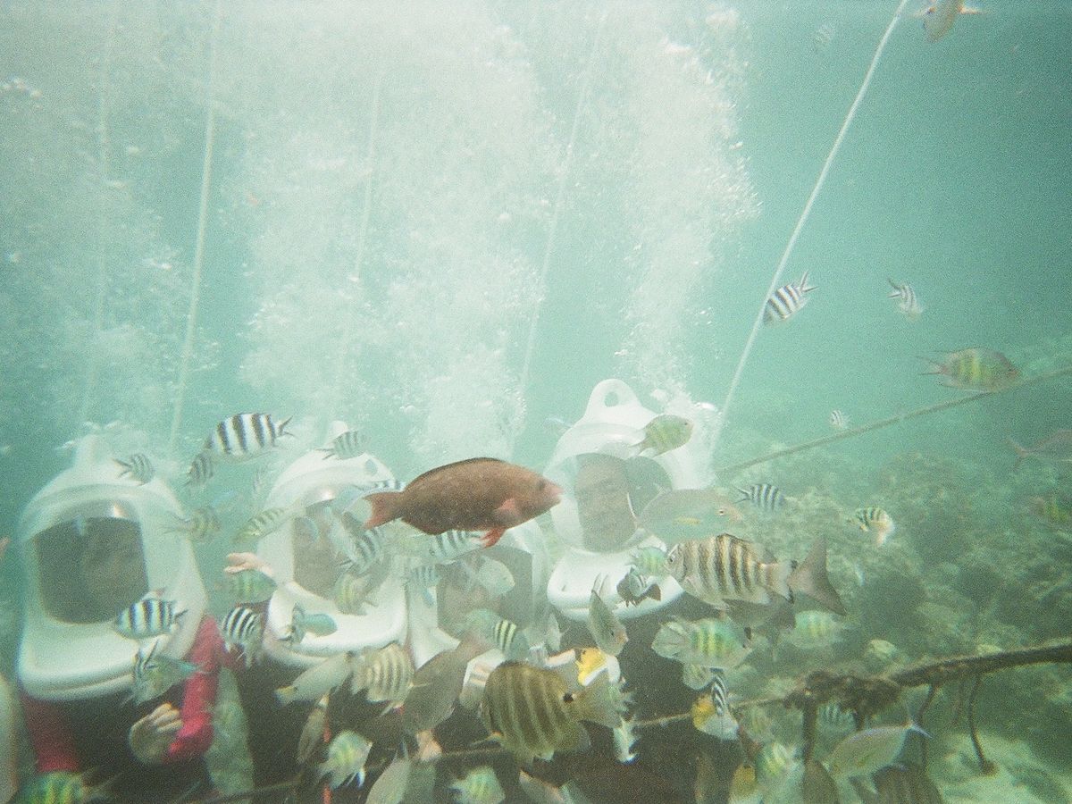 浜からロープを伝って、文字通り歩いて岩礁の海に入っていきます。潜る手前でヘルメットをかぶります。これが重いのにはびっくりしましたが、スタッフのみなさんがしっかり支えて深いところに送り出してくれます。餌としてソーセージを一人1本もらうのですが、魚が餌をつついてくる感触がなんともいえず、夢中になりました。欲を言えば、もう少し長く潜っていたかったのと、戻る時に来た道を戻るIターンではなくUターンで浜に戻ることができたら、一層楽しむことができたと思います。