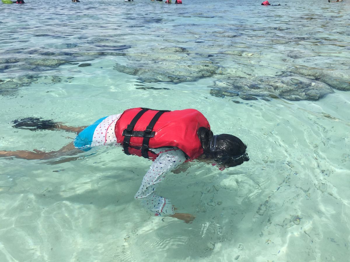 私と主人、12歳、9歳の子と母で参加しました。12歳の子が視力が弱いので事前に日本で度付きのシュノーケルマスクを買い持参。お風呂で練習したせいかもあってか、シュノーケルはみんな上手にできました。心配していた母もシュノーケルマスクはせずに水泳用のゴーグルだけで、深い海に入り楽しむことができました。9歳の子も海を自由自在に動いて楽めましたよ。餌付けされているので大きい魚小さい魚とたくさん見る事ができました!