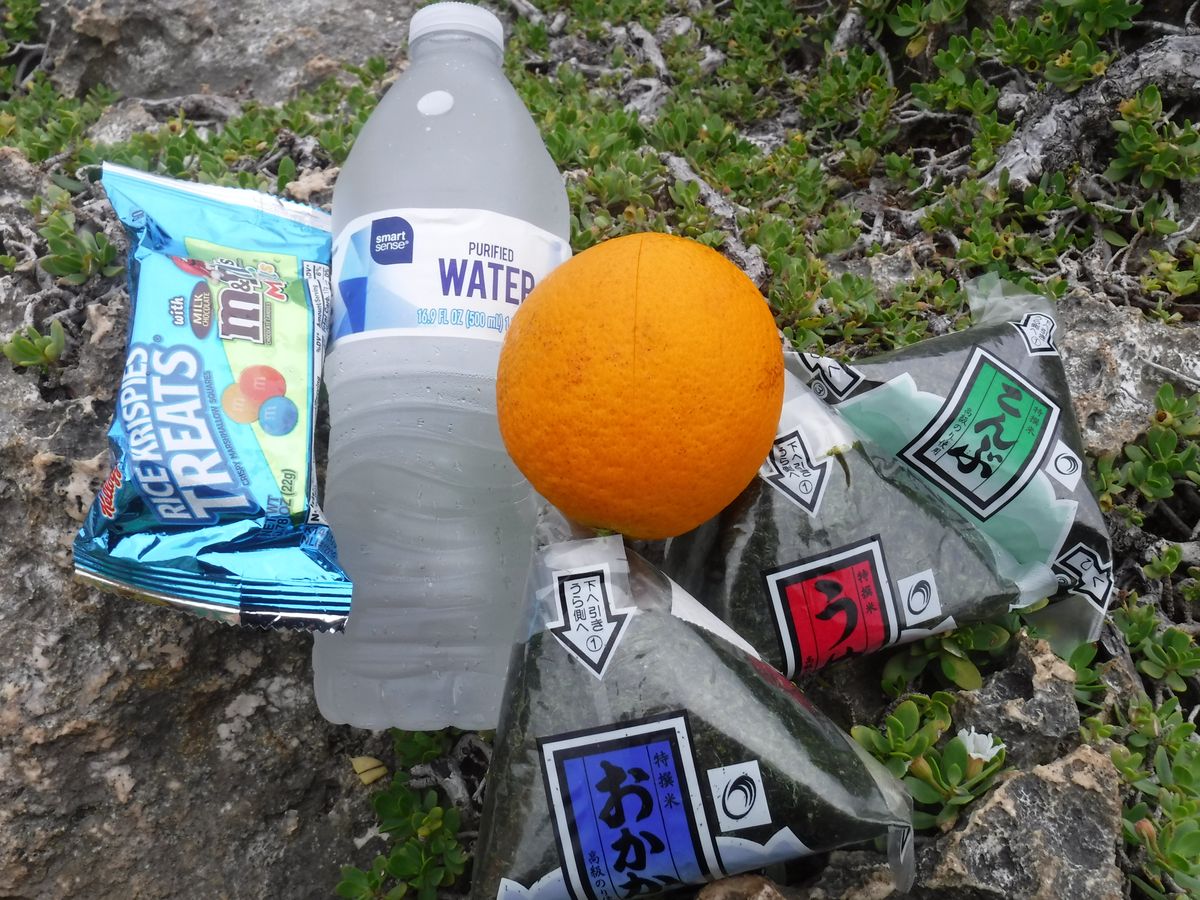 お昼用に大きいおむすび2個とオレンジ、チョコ菓子、小さいポテトチップス、凍らせた水と常温の水がついてます。