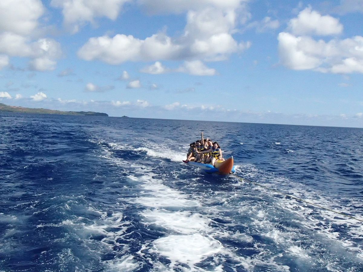 沖から戻る最中に、バナナボートの体験をしました。以前、私がグアムで体験した時はよく跳ねて、海に落ちた人もいたのですが、GTDSのバナナボートは静かな感じでした。
