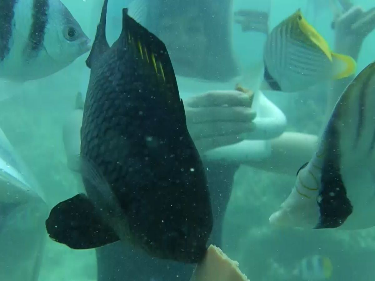 アクアウォーク。主人と8歳の息子が初めてだったので、体験してみました!私も20年以上ぶりだったので、最初は緊張するなぁと思っていたのですが、一緒に入ってくれるスタッフさんが、とっても親切でした。水の中でも体に力が入ってるように見えていたら、ジェスチャーで「腕を楽にね」と笑顔でやってくれて、本当に安心できました。私の先に行ってた息子のことが心配でしたが、さすがスタッフさん。最初少し怖がっていた息子のことも(スタッフさんにしがみついていた)、バッチリ!海の虜にしてくれました。ヘルメットの中の息子の笑顔を見て、そして主人も私も笑顔に♩たくさんの可愛い魚たちに、なんどもなんども餌のソーセジをつつかれて、きっと息子も、笑顔にならずにはいられなかったと思います♩海から上がった後に「まだやりたい!」と言いました。