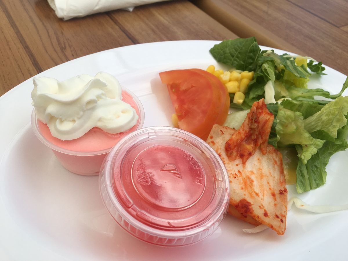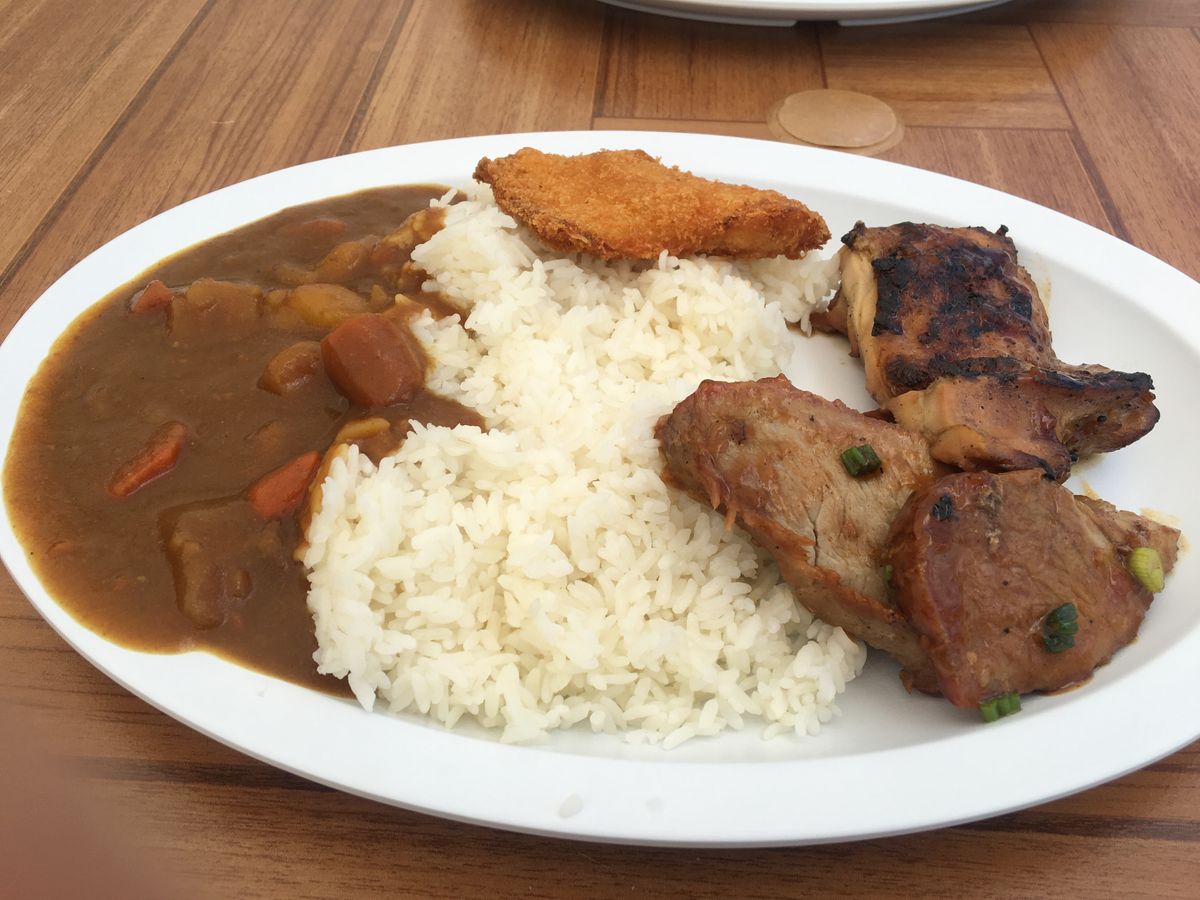 昼食はカレーがメイン。他にチキンとポーク(?)のBBQ、白身魚のフライ。サラダバーがあります。量は十分。女性には多いくらいかも。味もまずまずです。